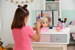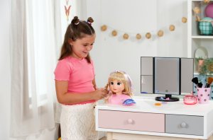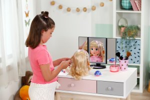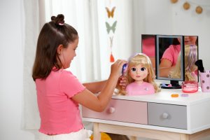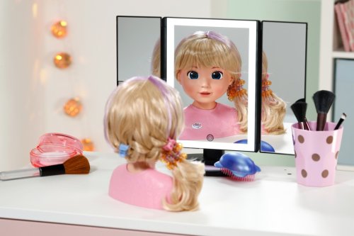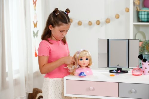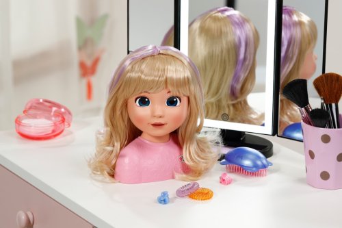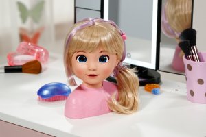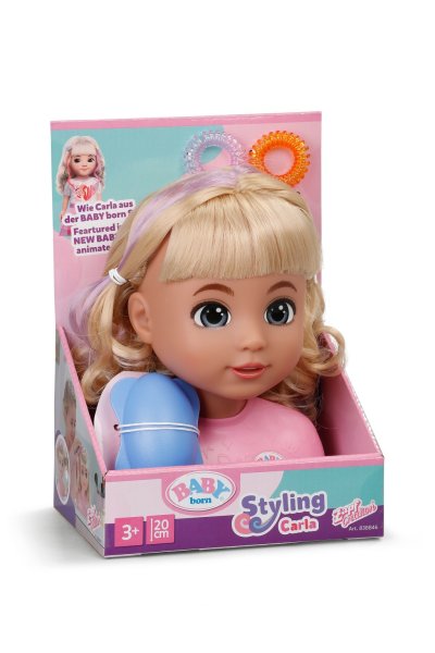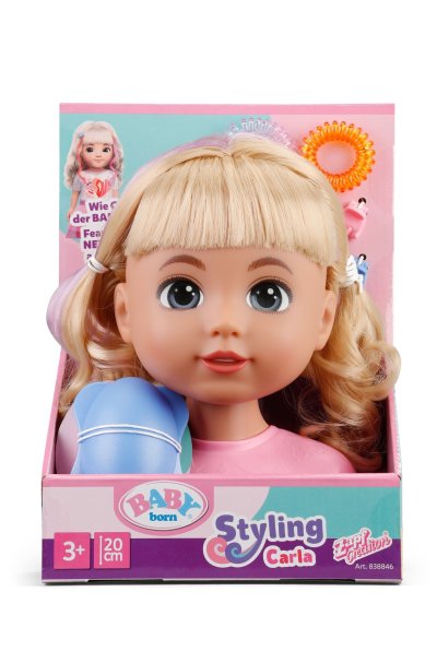 BABY born Česacia hlava Carla s doplnkami. • Kvalitné vlasy: Vysoko kvalitné nylonové vlasy, ktoré sa ľahko češú a upravujú. • Veľa doplnkov: kefa, sponky a gumičky. • Vhodné pre deti od 3 rokov.