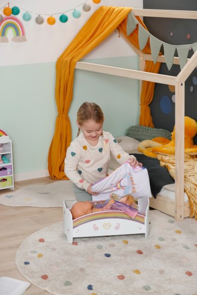 Zaspávanie nebolo nikdy krajšie. Dúhová postieľka BABY born so svojim zasneným dizajnom je zárukou sladkých snov. Kačička Berta pomáha hraním uspávanky, keď sa vezie po dúhe. Pri tom svieti ako nočné svetielko. Obojstranné lôžkoviny s farebným alebo jemným dizajnom sú ideálne na zababušenie. Samotnú dúhovú postieľku je možné tiež ozdobiť pomocou samolepiek z archu, ktorý je súčasťou balenia. Pssst! Pod matracom je tajná priehradka na malé poklady. A teraz už do postieľky, milá BABY born!