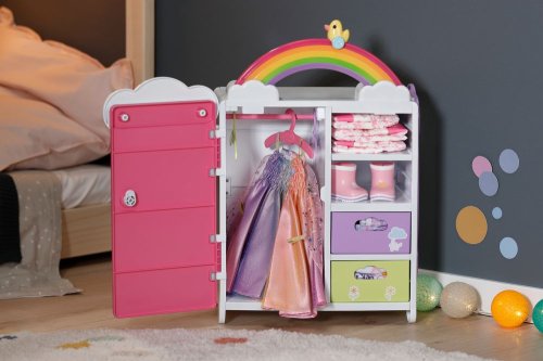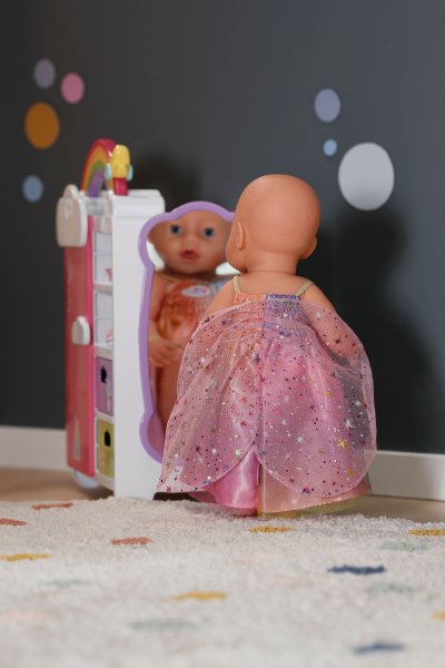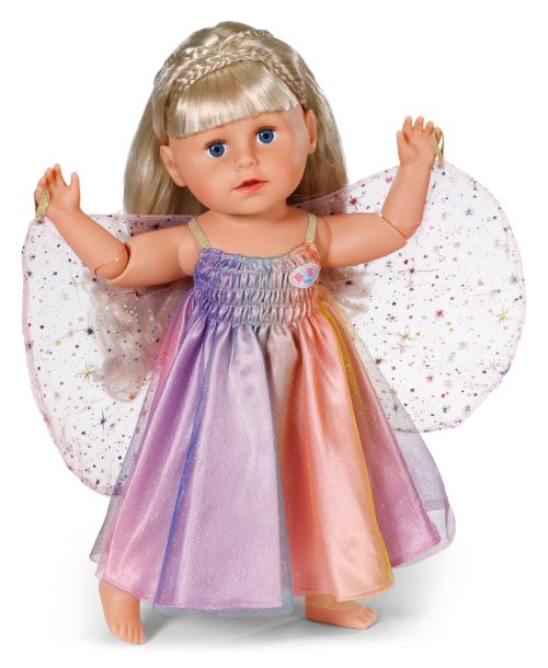 Nápadité dúhové šatôčky nabádajú k snívaniu: s našitými krídelkami sa BABY born vznáša dňom ako víla. Aby mohla mávať krídelkami, majú šatôčky našité malé pútka na ruky. Šatičky sa trblietajú všetkými farbami dúhy.