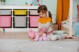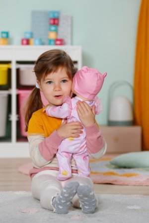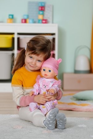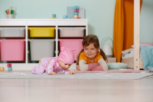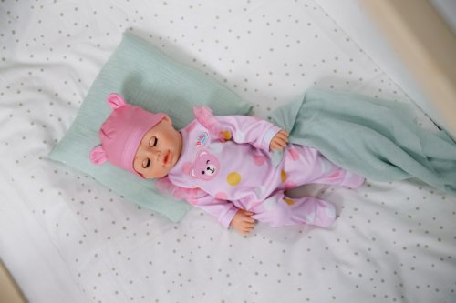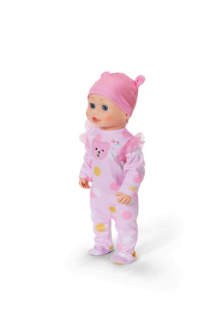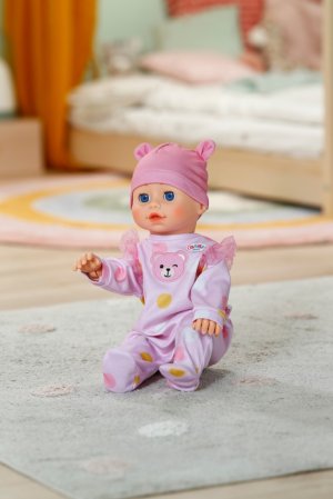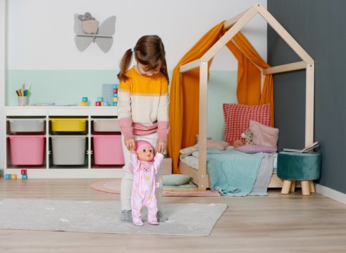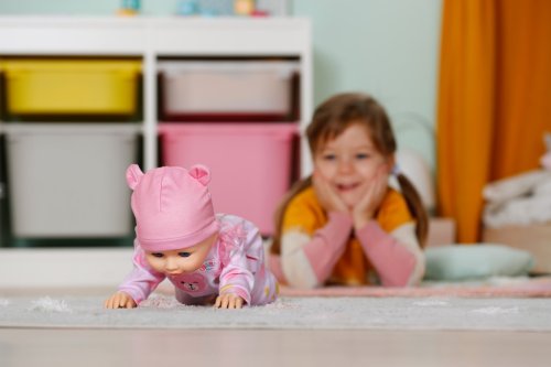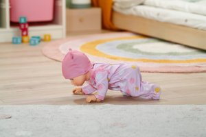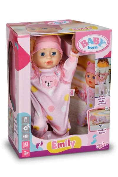 Baby born Emily vie liezť aj chodiť po nohách. Súčasťou sú roztomilé ružové dupačky a čiapočka. • Sama lezie po kolenách po miestnosti • Keď ju držíte za ruky, učia sa chodiť • Vydáva roztomilé detské zvuky, veselo sa smeje. Keď spadne, plače • Keď sedí, pohybuje ručičkami a nožičkami • Vyžaduje batérie – nie sú súčasťou balenia