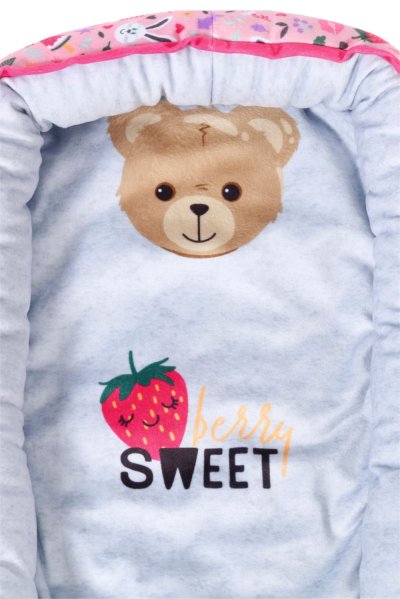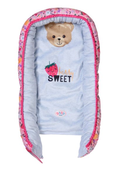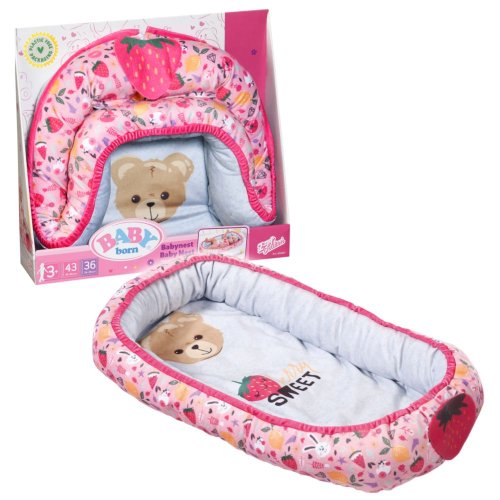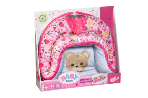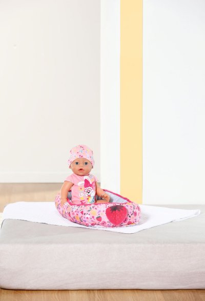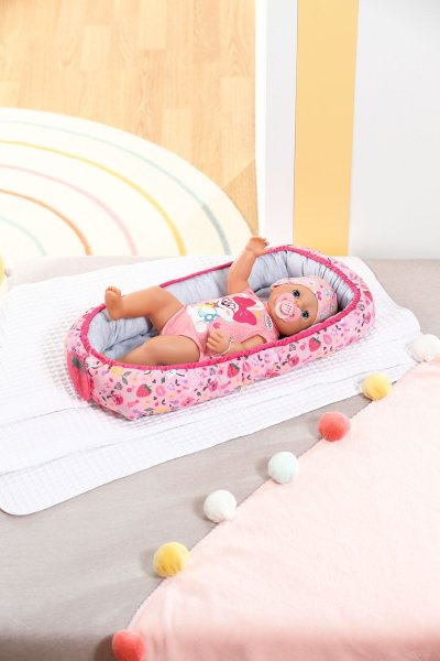 BABY born ticho leží vo svojom hniezdočku a užíva si pohodlie. Farebné hniezdočko v hravom dizajne s obrázkami ovocia a zvieratiek má v spodnej časti uzatvárateľný otvor, takže BABY born je možné ľahko vybrať z hniezdočka, vložiť ju do neho a hrať sa s ňou v hniezdočku. Vďaka mäkkému polstrovanému okraju je bábika v bezpečí a pohodlí, či už je na pohovke alebo na podlahe v detskej izbe. Vďaka obojstrannému designu sa dokáže prispôsobiť svojmu okoliu a zostáva pestrým doplnkom v detskej izbe.