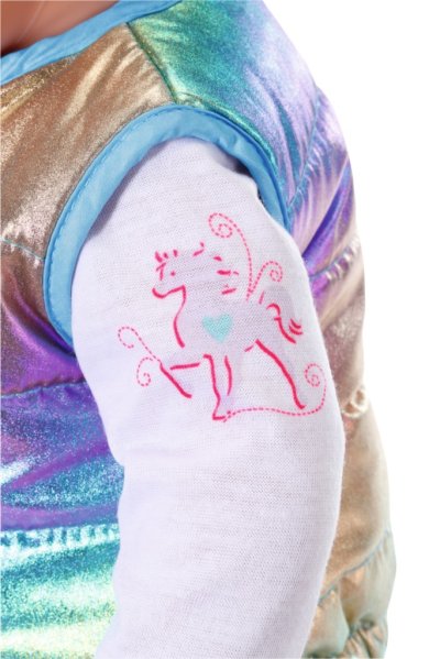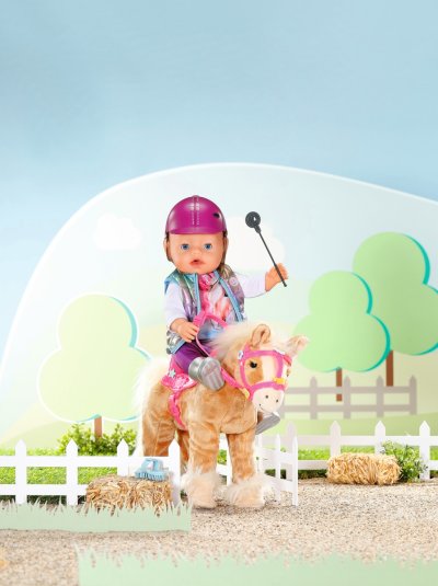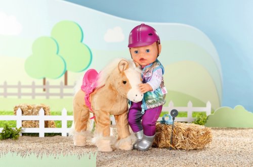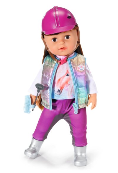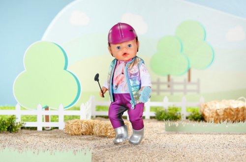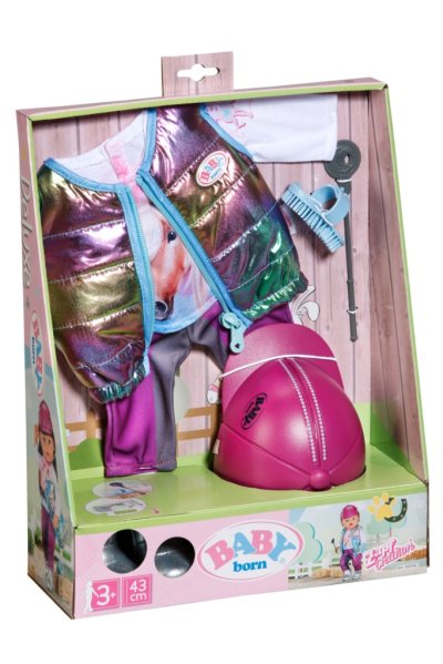 Na deň v stajniach potrebuje malá jazdkyňa to správne oblečenie: tričko s dlhými rukávmi, vestu, aby jej bolo pri jazde teplo, jazdecké nohavice a jazdecké topánky, aby mohla bezpečne sedieť v sedle. Samozrejme nesmie chýbať ani vhodná prilba. Myslelo sa aj na koníka BABY born. Súčasťou balenia sú doplnky aj pre neho: bičík a kefa na hrebelcovanie. Oblečenie padne aj Staršej sestričke BABY born a ďalším bábikám veľkosti 43 cm.