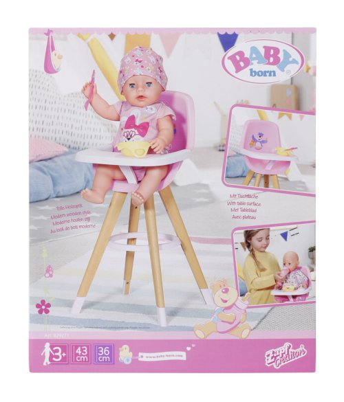 V praktickej jedálenskej stoličke je kŕmenie BABY born hračka. Stolička v škandinávskom dizajne má nohy vo vzhľade dreva a pohodlnú ružovú sedačku. Na opierke čakajú na obed medvedík Bruno a kačička Berta. Svetlo ružový stolček má veľa miesta aj na BABY born tanierik a fľaštičku. Stolček sa samozrejme hodí nielen na stolovanie, ale je ideálny aj na kreslenie, vyrábanie a hranie sa s kockami. • Originálny doplnok pre bábiky BABY born. • Pre nápaditú, rozmanitú a dlhotrvajúci hru plnú zábavy. • Produkt je vhodný aj pre menšie bábiky. BABY born Jedálenská stolička.