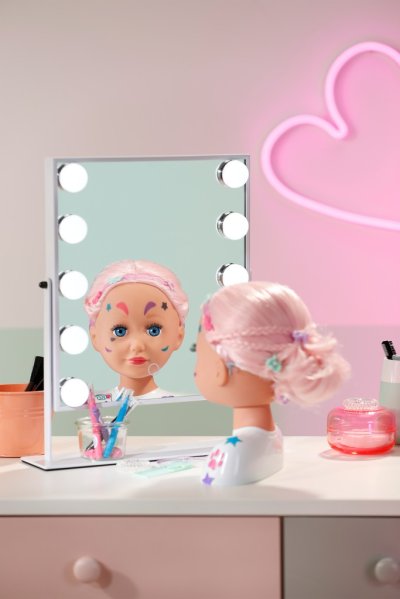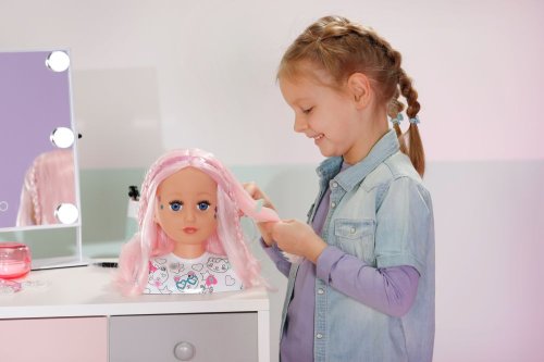S BABY born Kreatívnou česacou hlavou sa fantázii a kreativite medze nekladú. Česaciu hlavu vysokú 22 cm je možné nalíčiť a namaľovať pomocou dodaných fixiek a šablóny. Ale to nie je všetko: vyfarbiť sa dá aj tričko bábiky. Tričko môžete tiež dozdobiť niektorými z 10 nacvakávacích ozdôb. Zlatým klincom sú samozrejme dlhé ružové vlasy z vysoko kvalitného nylonu. Pomocou doplnkov z balenia je možné vykúzliť tie najúžasnejšie účesy. Čelenku do vlasov môžete tiež ozdobiť farebnými nacvakávacími ozdobami.