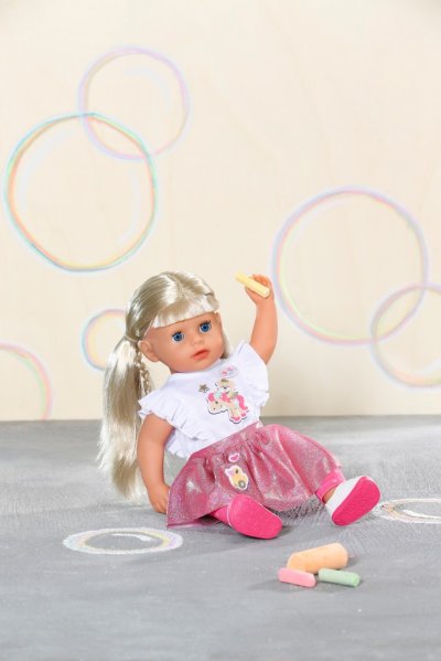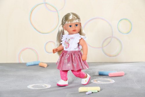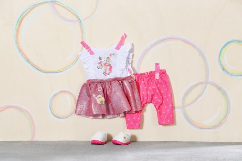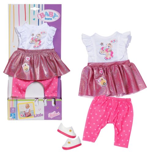 Nie je čo na seba? Nie s oblečením na každý deň pre BABY born Little, 36 cm. Top je možné kombinovať ako tričko s ružovými legínami s potlačou hviezdičiek alebo nosiť samostatne ako šaty. Súčasťou balenia sú samozrejme aj ladiace topánočky. Vďaka strihu easy fit je prezliekanie veľmi jednoduché.