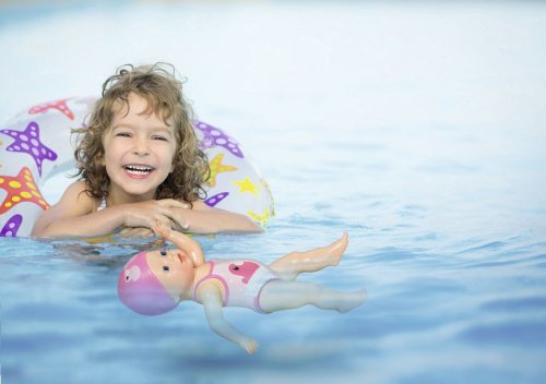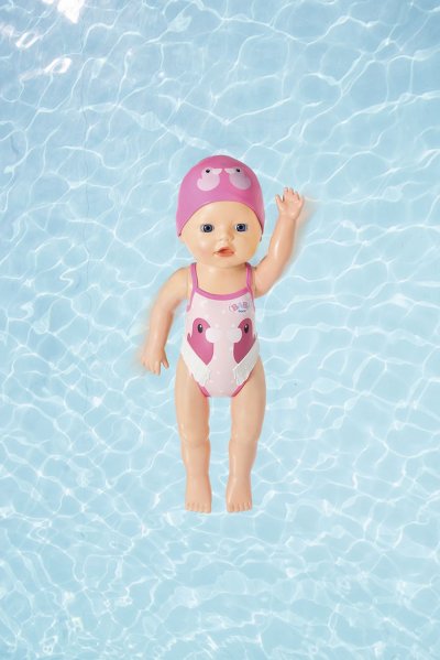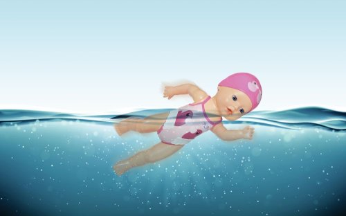 Malé dievčatko už sa toho na hodine plávania toľko naučilo. Najradšej má kraul a motýlika. Keď pláva kraul, strieda vo vode jednu ruku za druhou, u motýlika rukami hýbe narovnako. A všetko bez batérií! Stačí bábike natiahnuť ruky dozadu a je pripravená na ďalšie kolo. Keď jej ruky uvoľníš, začne vo vode plávať. Nohy a hlava „malého delfína“ sú tiež pohyblivé, takže Plaváček môže sedieť na okraji bazéna a pozorovať svoju mamičku a otecka. Plávacie čiapky a roztomilé plavky s motívom kačičky Berty as smiešnymi volánikmi sú vytlačené priamo na tele bábiky ako reliéf. • Originálna bábika BABY born. • Telo bábiky je vyrobené z vodotesného materiálu. • Po otočení ručičiek pláva kraula a motýlika. • Nie je potrebné batérií. • Veľkosť 30 cm. • Vhodná pre deti od 12 mesiacov. BABY born My First Plaváčik vo veľkosti 30 cm.