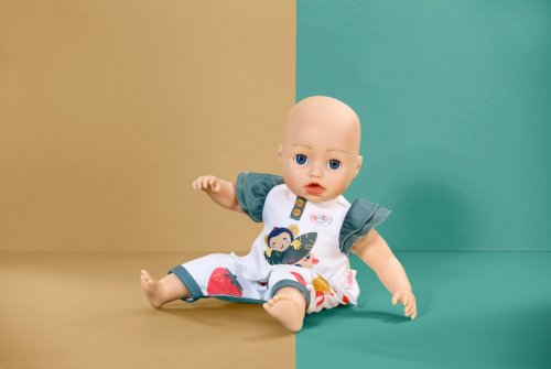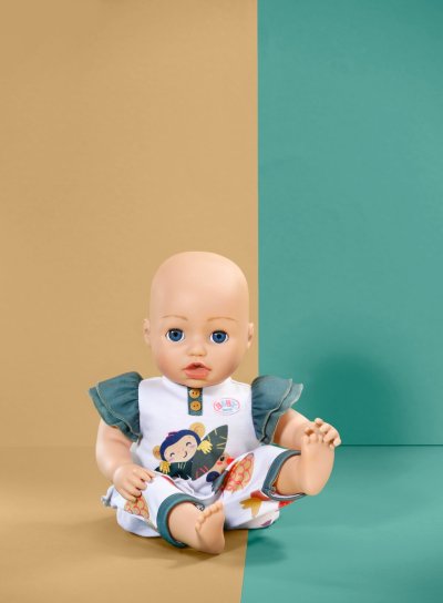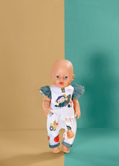 Z trička so zelenými volánkovými rukávmi sa na teba usmieva roztomilá opička medzi dvoma banánovými listami. Nohavice, ktoré k tričku skvele ladia, sú potlačené obrázkami rôznych druhov ovocia a kačičky Berty. • Sada tričká a nohavíc • Tričko aj nohavice sú ozdobené roztomilou potlačou opičky, kačičky Berty a ovocia • Tričko s gombíkmi a volánkovými rukávmi • Vhodné pre bábiky veľkosti 43 cm a pre medvedíkov BABY born Teddy • S ramienkom z reostrovaného materiálu, Kit