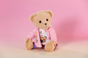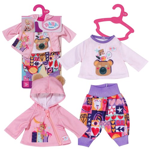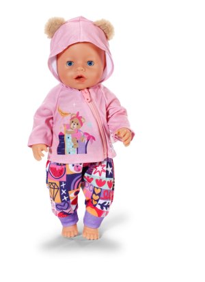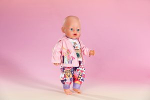 Roztomilý obleček pre bábätko sa skladá z troch častí: farebných nohavíc s fialovými lemami a patchworkovým vzorom vo veselých farbách, svetlo fialového trička s dlhým rukávom ozdobeného obrázkom medvedíka a roztomilé ružové bundy s kapucňou, ktorá má roztomilá hebká med. Vďaka tomuto outfitu je BABY born vždy krásne v teple. • Obleček pre bábätko skladajúci sa z nohavíc, tričká a bundy • Nohavice s farebným patchworkovým vzorom • Tričko s dlhým rukávom vo svetlo fialovej farbe s motívom medvedíka • Bunda s kapucňou, zipsom a uškami medvedíka • Vhodné pre bábiky veľkosti 43 cm a pre Bábiky veľkosti 43 cm z recyklovaného materiálu • Kvalitný doplnok pre radosť z nápaditej, rozmanitej a dlhotrvajúcej hry