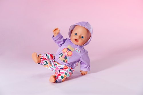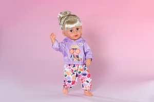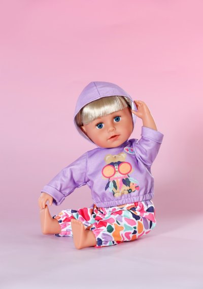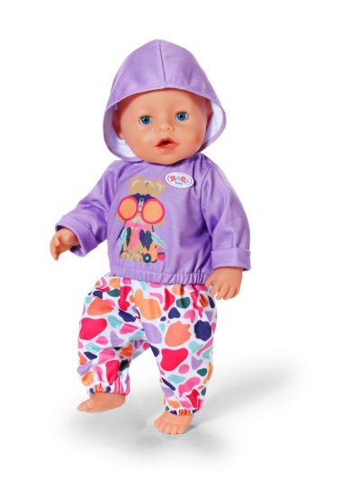 Športové oblečenie nemusí byť nudné: fialová mikina s veselou potlačou sa skvele hodí k farebným nohaviciam. • Sada mikiny a nohavíc • Mikina s smiešnou potlačou • Farebné nohavice • Vhodné pre bábiky veľkosti 43 cm a pre medvedíkov BABY born Teddy • S ramienkom z recyklovaného materiálu • Kvalitný doplnok pre radosť z nápaditej, rozmanitej a dlhotrvajúcej hry
