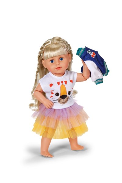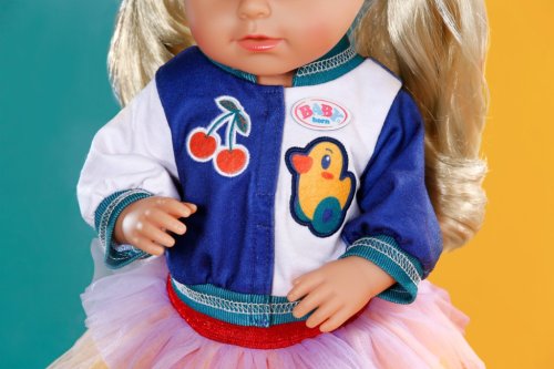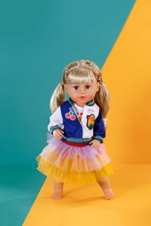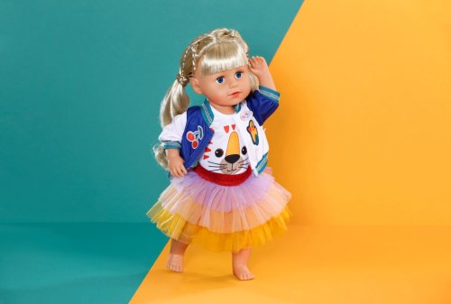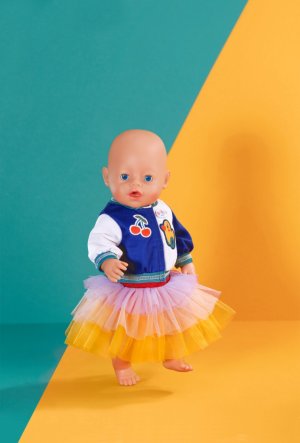 Tričko s tigriou tvárou, cool dvojfarebná bunda a tutu sukne vo farbách žltej, oranžovej a fialovej – tento outfit prinesie zaručene farebný akcent aj do tých najšedivejších dní. • Outfit s farebnou tutu sukienkou, bundou a tričkom • Vhodné pre bábiky veľkosti 43 cm a pre medvedíkov BABY born Teddy • S ramienkom z recyklovaného materiálu • Kvalitné oblečenie a doplnky pre radosť z nápaditej, rozmanitej a dlhotrvajúcej hry