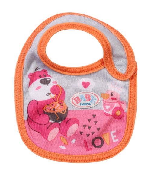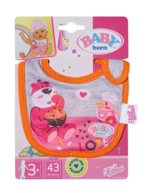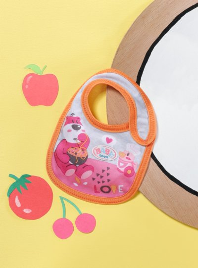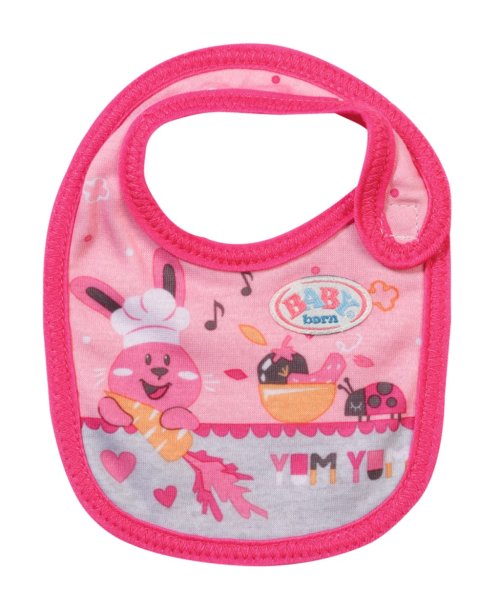 Tu sa niekto pocintal. Akonáhle BABY born pije mlieko alebo jej kašičku, vždy sa niečo rozleje. Čím viac si jedlo užíva, tým viac sa pobryndá. Preto má malý jedák pripravené dve náhradné podbradníky. Na ružovom podbradníku je obrázok zajačika Benna v kuchyni. Pozná tie najlepšie recepty na prípravu mrkvičky. Na oranžovom podbradníku spokojne hoduje medvedík Bruno. Chutia mu ale iba špagety, ktoré pripraví kačička Berta.