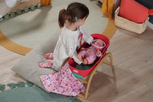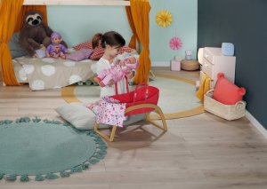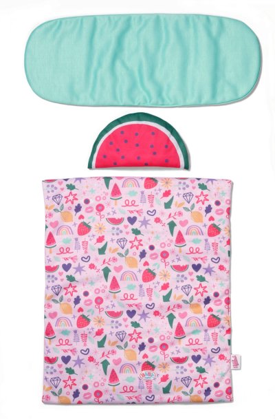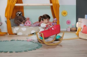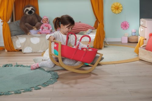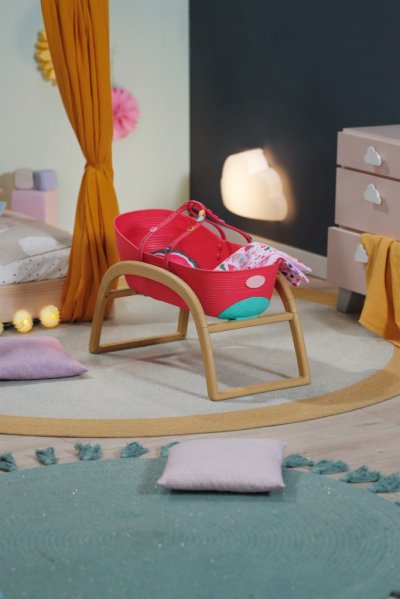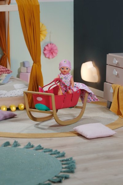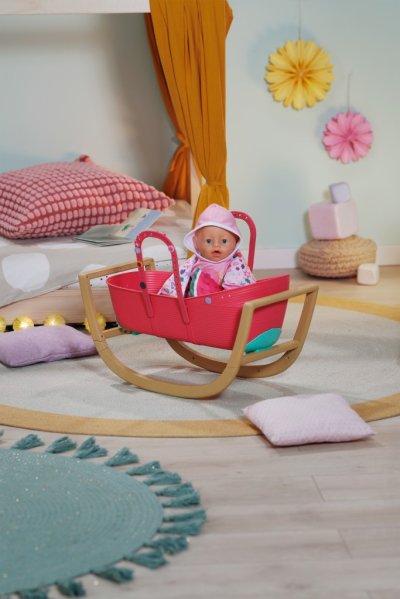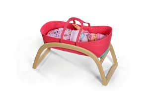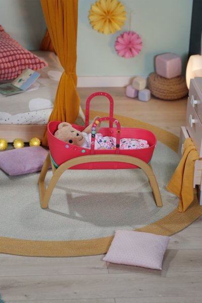 BABY born Postieľka 3 v 1 s nacvakávacími ozdobami. • Univerzálny dizajn 3 v 1: Postieľku je možné v niekoľkých jednoduchých krokoch ľahko premeniť na prenosný košík, kolísku alebo detskú postieľku. • Kompletná sada lôžkovín: Mäkký vankúšik v tvare melónu, mäkká prikrývka s motívmi ovocia a matraca. • Sladké zaspávanie: Vďaka stabilnej konštrukcii a jemnému hojdaniu môžu bábiky a plyšové hrany zaspávať ako v skutočnej kolíske. • Kreativita: Pomocou farebných nacvakávacích ozdôb, ktoré je možné pripevniť na okraj košíka a na rukoväti, je možné postieľku rôzne zdobiť znova a znova.