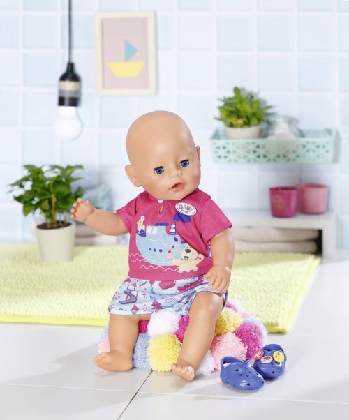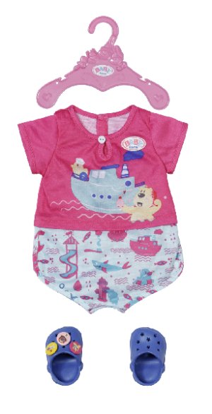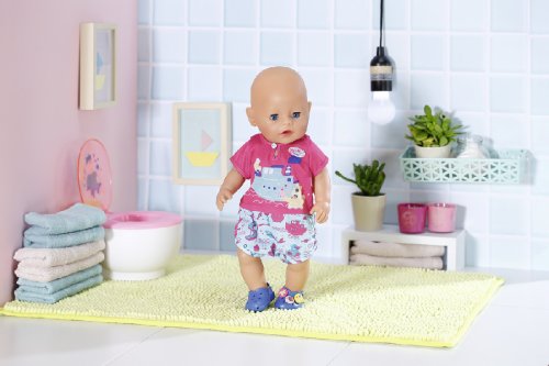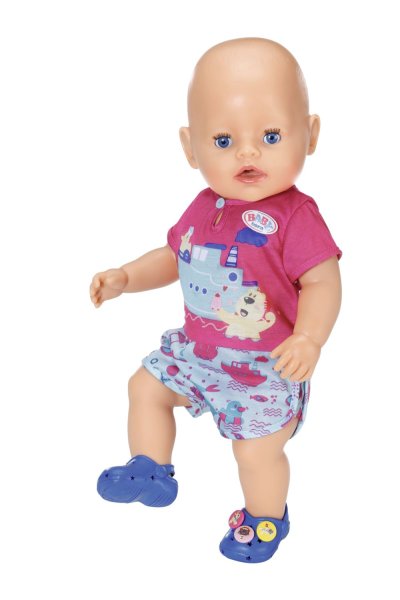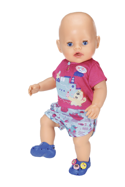 Kapitánka parníka Berta udržuje smer kúpeľňa, zatiaľ čo sa medvedík Bruno kúpe vo vlnách... Takto či podobne by mohla začínať historka, ktorou rozpráva potlač na hornom diele pyžamka. Nohavičky súpravy sú ozdobené potlačou akvaparku. Aby nožičky na studených dlaždičkách neprechladli, nosia BABY born modré papučky s roztomilými ozdobami. • Kvalitné oblečenie pre originálnu bábiku BABY born. • Pre radosť z nápaditej, rozmanitej a dlhotrvajúcej hry. • Veľmi ľahké prezliekanie. BABY born Pyžamko a papučky pre bábiky veľkosti 43 cm. Súčasťou je overal a topánky. Vrátane ramienka.