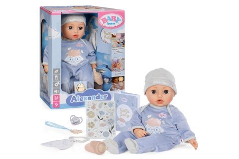 BABY born Alexander reaguje na dotyky a interakcie roztomilými pohybmi a zvukmi. Keď ho kŕmite z fľaštičky alebo cumlá cumlík, pohybujú sa mu pri tom oči a pusinka – takmer ako u skutočného bábätka. Po jedle potrebuje malú pauzu. Keď jemne poklepete na jeho chrbátik, odgrgne si. Keď je unavený, dá sa jemne kolísať k spánku v dvoch smeroch. Detská gymnastika zvyšuje zábavu pri hre: Alexander vydáva radostné detské zvuky, keď sa pohybujú jeho ruky a nohy. Keď ho posteklíte na brušku, reaguje veselým smiechom, a keď je toho príliš, dokonca vykúzli malý detský prdík! BABY born Alexander má navyše všetko, čo potrebuje na hravú a láskyplnú starostlivosť: fľaštičku, cumlík so šatkou, medailónok, rodný list a hárok samolepiek. Jeho roztomilý outfit s dupačkami a čiapočkou tvorí kompletnú sadu pre bábiky. Všetky oblečky BABY born vo veľkosti 43 cm mu skvele padnú. Rozmery balenia 30x40x20 cm. Napájanie na 3xAA batérie - nie sú súčasťou balenia. Vek 3+