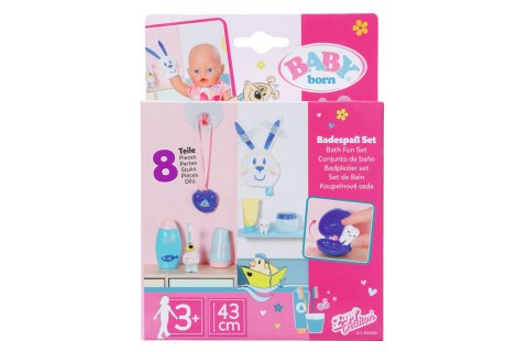 Bábika BABY born už vie, ako si čistiť zúbky. A tiež presne vie, aké dôležité je poriadne sa umývať aj za ušami. Vo svojej kúpeľňovej sade nájde všetko, čo je na umývanie potrebné. Kefka vyzerá ako medvedík v kostýme námorníka. Ku kefke patrí žltá tuba na zubnú pastu. Bude ešte chvíľu trvať, kým BABY born vypadnú mliečne zúbky, ale napríklad jej zúbková víla aj tak niečo prinesie, keď si pod vankúš schová zúbok. Môže ho ale schovať aj do krabičky na vypadnuté zúbky alebo do modrej dózy. Súprava obsahuje tiež žinku na umývanie v tvare zajačika, fľaštičku na sprchový gél a tubu na krém. Kvalitné príslušenstvo pre značkovú bábiku BABY born. Pre radosť z nápaditej, rozmanitej a dlhotrvajúcej hry. BABY born Kúpeľňová sada na hranie nielen vo vani obsahuje 8 doplnkov do kúpeľne. Rozmery balenia 13x18x4 cm. Vek 3+