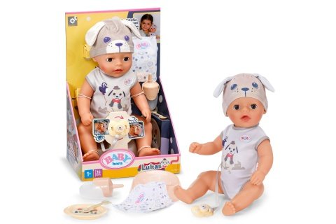 BABY born Lukas Psík je ideálna prvá bábika pre deti od 1 roku. Vďaka svojej kompaktnej veľkosti 36 cm a 7 jednoduchým funkciám sa ľahko drží - perfektné pre malé detské ruky a prvé hranie s bábikou. Lukas funguje úplne bez batérií a prináša všetko, čo potrebujete. Vie piť z fľaštičky, čúrať do látkovej plienky alebo chodiť na nočník. Po kontakte s vodou sa plienka sfarbí a ukáže žlté srdiečko. Milý detail, ktorý prispieva k realistickej hre. Keď dostane svoj cumlík, ktorý je pripevnený k jej dupačkám s roztomilým motívom so psíkom, kúzelne otvára a zatvára oči. Otočením cumlíka doľava zavrie oči, otočením doprava ich zase otvorí. Keď ho položíte do postieľky, zatvoria sa oči aj bez cumlíka, akoby naozaj spala. Jeho pohyblivé ruky a nohy a otočná hlava uľahčujú obliekanie a vyzliekanie. Vďaka menšej veľkosti a jednoduchým funkciám je Lukas ideálny pre malé detské ručičky a pozýva k zábavnej hre pri kŕmení, prebaľovaní a uspávaní. Rozmery ablení 22x33x17 cm. Vek 1+