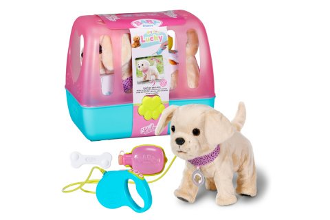 Kamarát BABY born, veselý psík, chodí na vodítku a veselo šteká. Keď ho pohladíte po chrbte, vrtí chvostíkom a budete počuť roztomilé psie zvuky. Vie piť vodu zo svojej mištičky. Skloní hlavu, vyplázne jazyk a je počuť, ako srká. Potom, čo sa napije, zdvihne nohu a vyciká sa. Skoro ako skutočný psík! Samozrejme potrebuje aj svoju kocku: ak ju psíkovi pridržíte pred ňufákom, budete počuť zvuky chrúmania. Jeho box využijete nielen pri cestovaní, ale aj ako miesto, kde môže psík odpočívať. Psík je obľúbeným zvieracím kamarátom BABY born Emmy, s ktorou hrajú v animovanom seriáli BABY born. Nezabudni sa pozrieť! Vek 3+