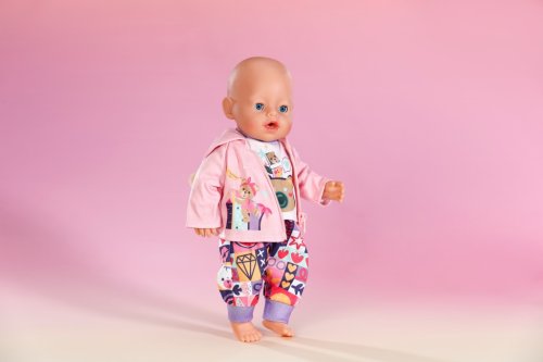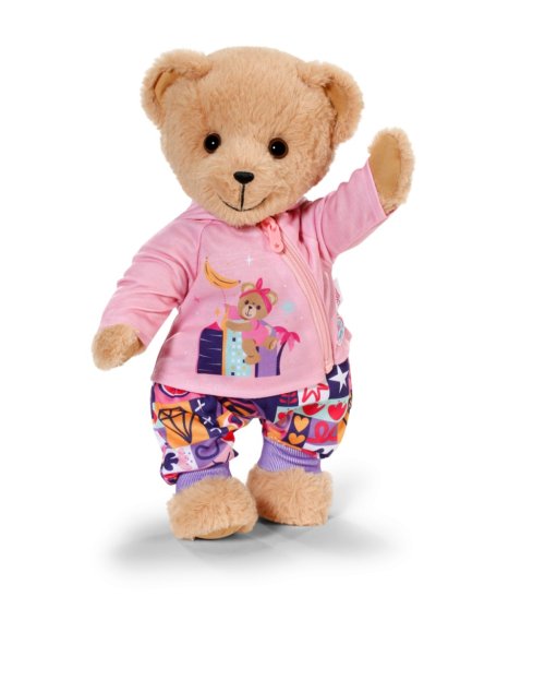 Roztomilý outfit udrží bábätko pekne v teple vďaka nohaviciam s patchworkovým vzorom, svetlo fialovému tričku s dlhým rukávom a praktickej ružovej mikine s kapucňou. Obleček pre bábätko skladajúci sa z nohavíc, tričká a bundy. Nohavice s farebným patchworkovým vzorom. Tričko s dlhým rukávom vo svetlo fialovej farbe s motívom medvedíka. Bunda s kapucňou, zipsom a ušami medvedíka. Veľkosť 43 cm. Vek 3+