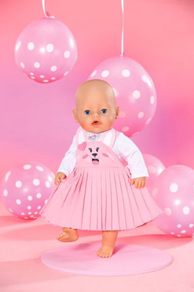 Malá parádnica BABY born má vo svojej skrini niektoré doslova sviatočné kúsky. Sú ale také krásne, že by ich BABY born najradšej nosila stále. Napríklad na tieto šatôčky sa teší, že ich bude nosiť nielen na Veľkú noc. Na hornej časti ružových šiat je vidieť radostnú tvár zajačika. Ouška mu prechádzajú priamo do trakov. Naspodku je k šatám všité ako 2v1 tričko s dlhým rukávom. S plisovanou sukienkou si niekto dal naozaj veľa práce, aby ju tak presne zložil. BABY born Šatičky zajačik pre bábiky veľkosti 43 cm. Vrátane ramienka.