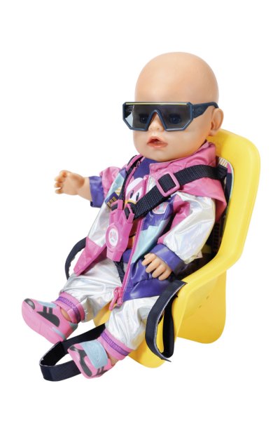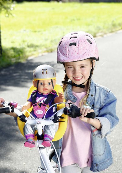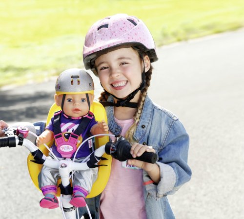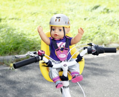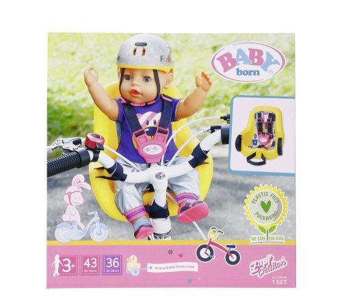 BABY born síce už usilovne jazdí na svojom bicykli so stabilizačnými kolieskami, ale dlhšie trasy ešte krátke nôžky nezvládnu. To sa malá cestovateľka radšej vezie v sedačke na bicykli svojej malej mamičky. Pohodlná sedacia plocha ergonomicky tvarovanej sedačky je potlačená geometrickými vzormi. Vďaka systému popruhov ide BABY born v sedačke vždy stabilne, aj keď to hojdá a hopsa. Pomocou suchých zipsov je možné sedačku upevniť na riadidlá rôznych detských bicyklov. A vyrážame! Kvalitný doplnok pre originálnu bábiku BABY born. Pre radosť z nápaditej, rozmanitej a dlhotrvajúcej hry. Vhodný aj pre menšie bábiky. BABY born Sedačka na bicykel pre bábiky veľkosti 43 cm. S bezpečnostnými pásmi. Rozmer balenia cca 26 x 27 x 12 cm. Vek 3+
