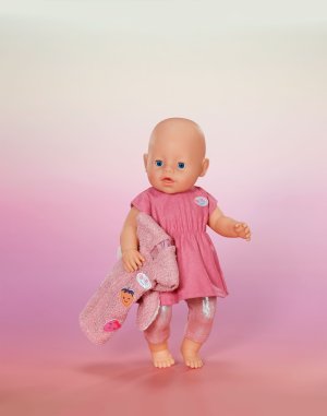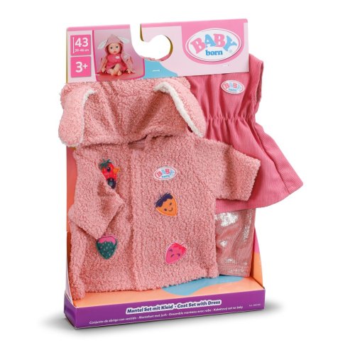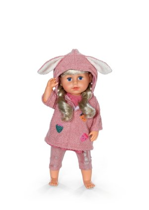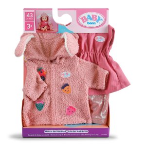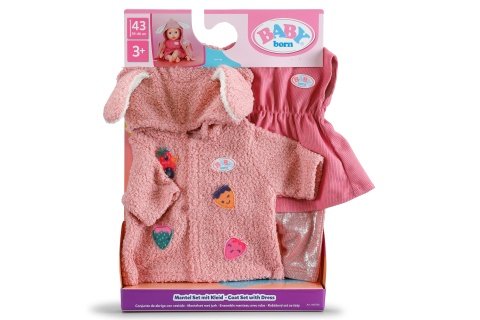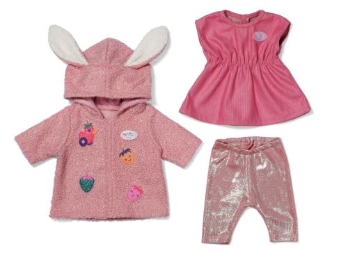 Súprava s kabátikom premení BABY born na roztomilého zajačika. Plyšový kabátik s uškami na kapucni a jahodovými detailmi zahreje v chladnejších dňoch. Pod ním sa skrývajú šatôčky a legíny. Jednoducho ideálny outfit pre každé ročné obdobie. Vek 3+