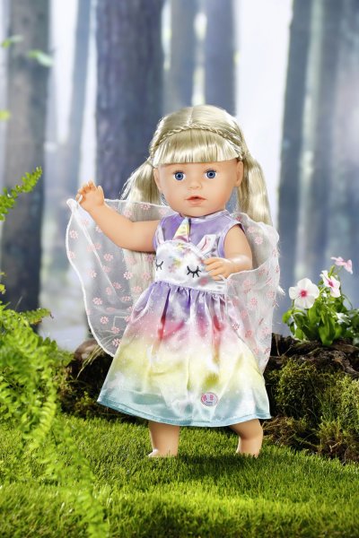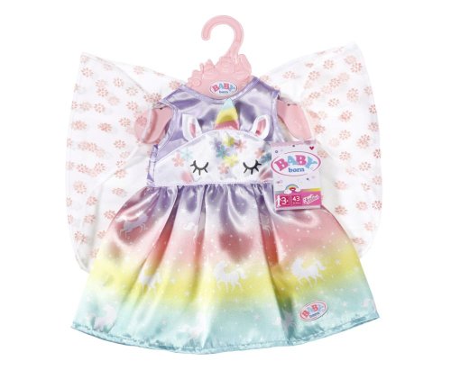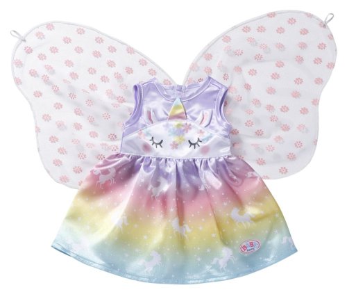 Víly a jednorožce k sebe patria rovnako ako mlieko a sušienky. Vília šatôčky pre bábiku BABY born sú ušité z nádhernej dúhovej látky. Sukienka je potlačená kúzelnými jednorožcami tancujúcimi po hviezdnej oblohe. Horná časť šiat je vpredu ozdobená tvárou jednorožca s našitými uškami a farebným rohom. Správna víla musí mať samozrejme aj krídelká. Priehľadné krídelká s trblietavými kvietkami sú všité do zadnej časti šiat a akonáhle BABY born prestrčí ruku malým očkom v hornej časti krídielok, otvoria sa. • Originálne oblečenie pre bábiky BABY born. • Pre nápaditú, rozmanitú a dlhotrvajúcu hru. BABY born Rozprávkový kostým "Jednorožec" pre bábiky vo veľkosti 43 cm. Súčasťou je ramienko.