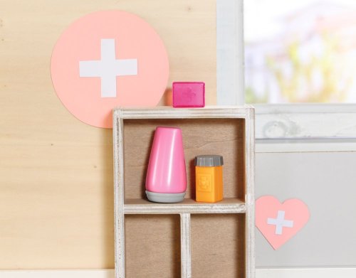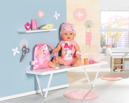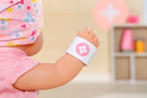 „Au, to bolí!“ Ajéje, po tvárach BABY born sa gulia slzy ako hrachy. Zakopla totiž o škôlkový batôžtek svojej malej sestričky. Tá malá uličnica vždy necháva svoje veci ležať uprostred predsiene. Bratříček rýchlo uteká pre sadu s prvou pomocou. Úplne profesionálne ako skutočný záchranár si hneď nasadzuje ružovú rúšku. Potom z tašky vytiahne všetko, čo potrebuje na ošetrenie rozbitého kolena bábiky BABY born. Tubu s masťou a obväz, ktorý nožnicami ešte trochu upraví. Akonáhle BABY born zbadá krabičku s liekmi a lyžičku s medicínou, vykulia oči. Lieky ale zatiaľ našťastie nepotrebuje. Bratříček záchranár chce radšej ešte zmerať teplotu. Malá kaskadérka ju má z rozrušenia trochu zvýšenú. Napríklad by sa ohrievacia fľaša mohla zmeniť na chladiaci vankúšik. Potom braček všetkých 9 zdravotných pomôcok schová späť do látkového vrecka, ktorý zdobí obrázok zdravotnej kačičky Berty.