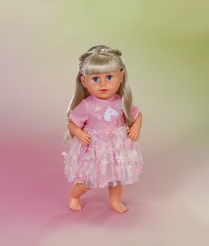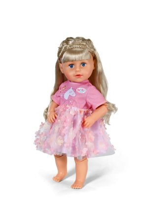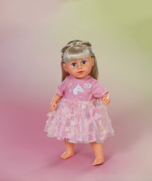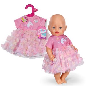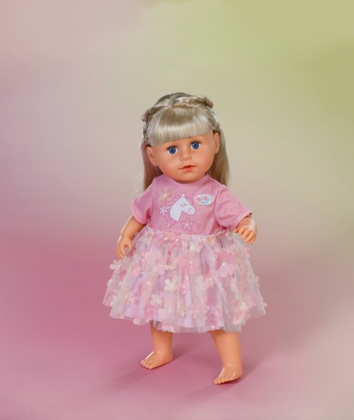 Teda, to sú šaty! Vďaka snovému dizajnu a prepracovaným detailom rozjasní každú bábiku. Šaty sú ozdobené roztomilým motívom jednorožca a farebnými kvetmi, čo z nich robí rozprávkovo krásny kúsok. BABY born Emma sa už nemôže dočkať, až si ich oblečie. • Šaty pre bábiky s krátkymi rukávmi • Potlač jednorožca a kvetinové detaily na hornej časti • Sukne z ľahkého materiálu so žltými a ružovými našitými kvetinami • Pre bábiky veľkosti 43 cm • Rozširuje možnosti hry, podnecuje fantáziu a povzbudzuje deti k hre na malých rodičov