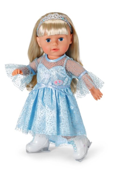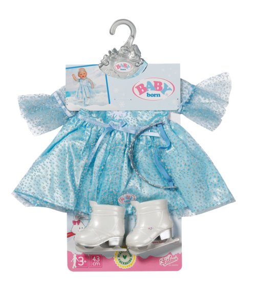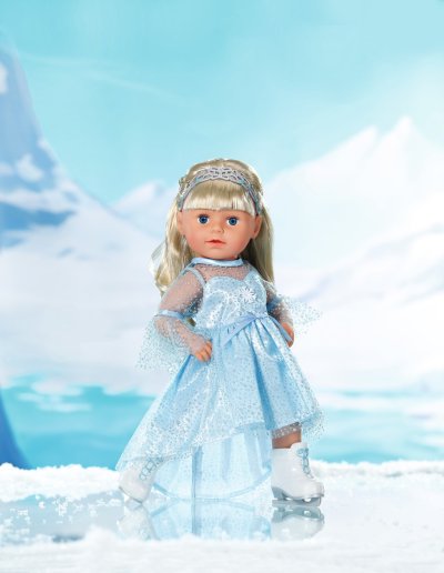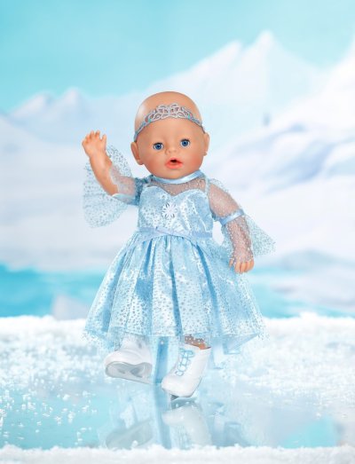 BABY born v trblietavých šatách pre ľadové princezné nejde prehliadnuť. V krásnych korčuliach ľahko kĺže po zamrznutom jazere s Teddym a Carlou. K šatám patrí aj diadém, ktorý skvele drží na hlave počas všetkých piruet.