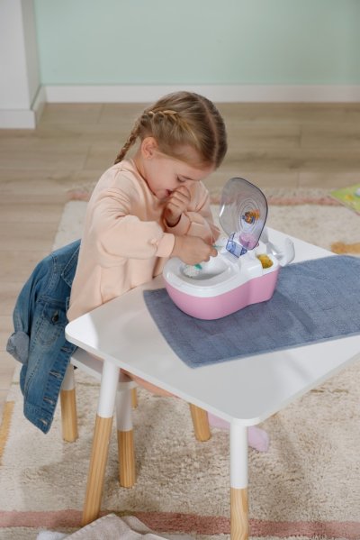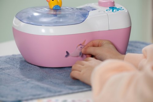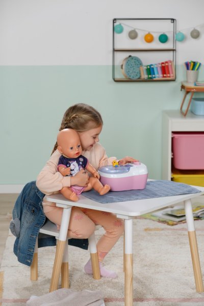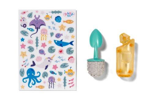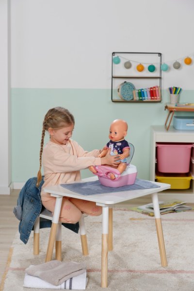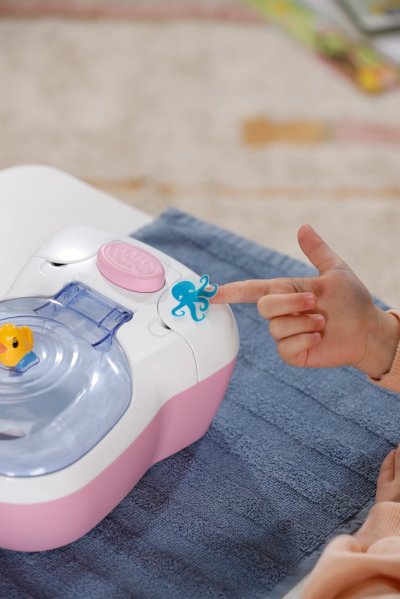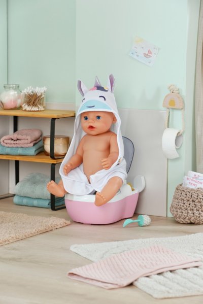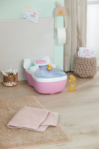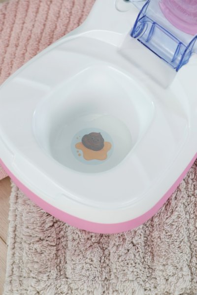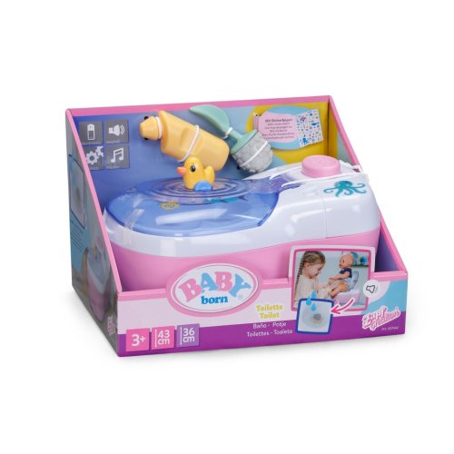 BABY born toaleta s vodným prekvapením a smiešnymi zvukmi. • Legrační zvuky a melódie: Akonáhle BABY born sedí na toalete, budete počuť šplechajúce zvuky. Pokiaľ zostane na toalete sedieť dostatočne dlho, začne hrať vtipná melódia. Potom zaznie zvuk splachovania. • Kúzlenie s vodou: Keď sa do toalety nakvapká voda, objaví sa v nej obrázok cikania a kakania. • Hravý tréning hygieny: WC kefa a fľaštička na čistiaci prostriedok pomáhajú udržiavať toaletu čistú a je možné ich uložiť do praktických priehradok. • Kreatívny dizajn: Farebné samolepky s obrázkami podvodného sveta slúžia na ozdobenie toalety.