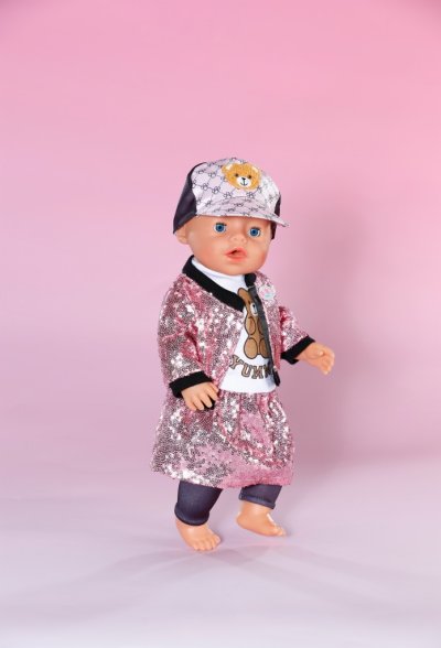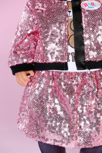 Ružové flitre na sukni a bunde nádherne žiaria. Aj zvyšok outfitu je naozaj štýlový a stojí za to ho vidieť! • Outfit s ružovou flitrovou bundou, sukňou, tričkom, čiapkou a legínami • Vhodné pre bábiky veľkosti 43 cm a pre medvedíkov BABY born Teddy • S ramienkom z recyklovaného materiálu • Kvalitné oblečenie a doplnky pre radosť z nápaditej, rozmanitej a dlhotrvajúcej hry