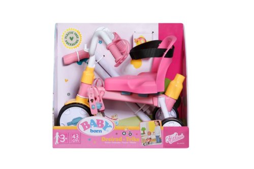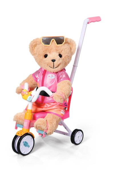 Pozor, prichádza BABY born! Na svojej novej trojkolke závodí s medvedíkom Teddym a kamarátkou Evou. Vďaka funkčným kolieskam môže BABY born na svojej trojkolke jazdiť ako na skutočnej trojkolke. Klaksón v tvare kačičky Berty sa postará o to, aby sa jej nikto nepriplietol do cesty. Pútka na pedále a bezpečnostné pásy zaisťujú bezpečnú jazdu. Aby BABY born nemohla jednoducho sama odísť, je k dispozícii odnímateľná 45 cm dlhá vodiaca tyč, ktorú je možné k trojkolke pripevniť. To znamená, že BABY born je možné na trojkolke tiež voziť na prechádzky a tlačiť ju, pokiaľ jej príliš sťažnú nohy. V animovanom seriáli pre deti sa BABY born Emma na trojkolke vydáva na dobrodružnú cestu s kamarátkou Evou a medvedíkom Teddym a spoločne vyrážajú za padajúcou hviezdou. Ak chcete zažiť vzrušujúce dobrodružstvo s nimi, pozrite sa na náš kanál BABY born v češtine na YouTube.