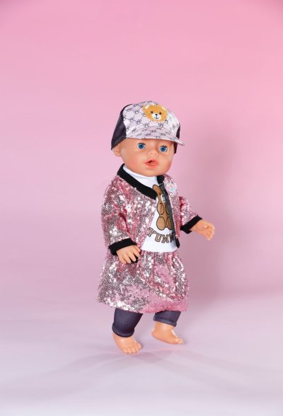 BABY born trblietavé oblečenie s ružovou sukňou a bundou z flitrov, tričkom s potlačou medvedíka, čiapkou a legínami pre bábiky veľkosti 43 cm. • Glamour na maximum: Outfit tvorený ružovou flitrovou bundou, sukňou, tričkom, čiapkou a legínami. • Udržateľnosť: Súčasťou je ramienko z recyklovaného materiálu. • Vhodné pre bábiky veľkosti 43 cm a pre medvedíkov BABY born Teddy. • Kvalitné oblečenie a doplnky pre radosť z nápaditej, rozmanitej a dlhotrvajúcej hry.