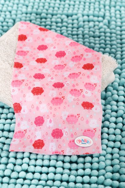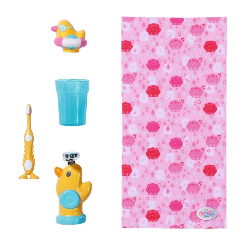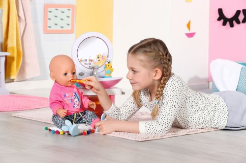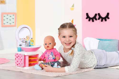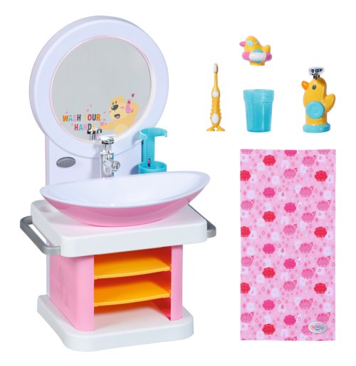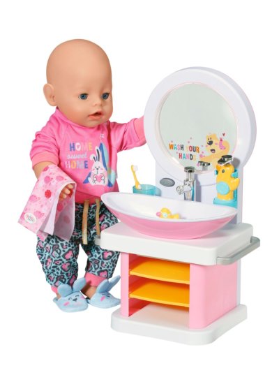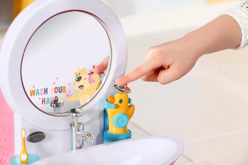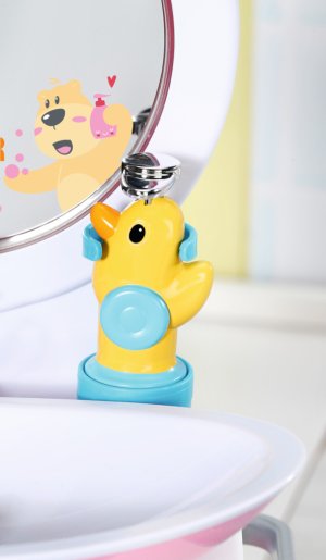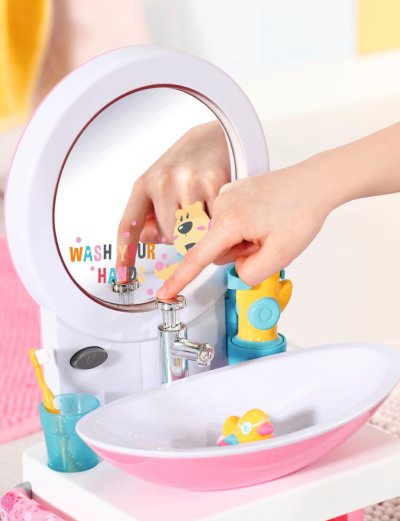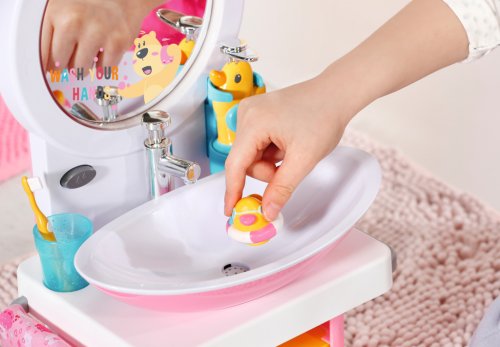 BABY born Umývadlo so svetelnými a zvukovými efektmi. Súčasťou je zubná kefka, téglik, dávkovač mydla, špunt v tvare kačičky a uterák.