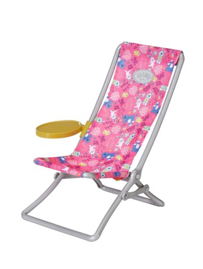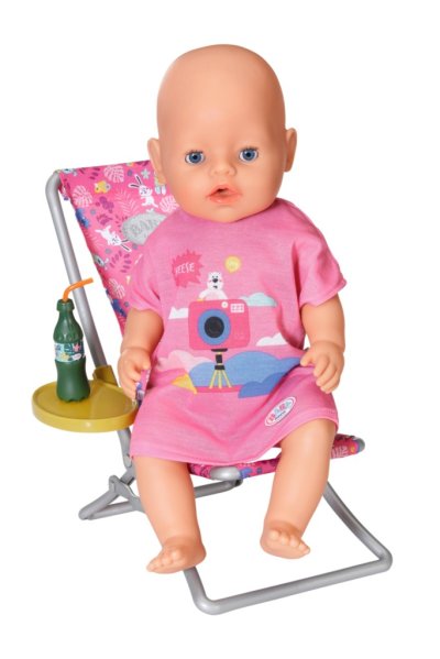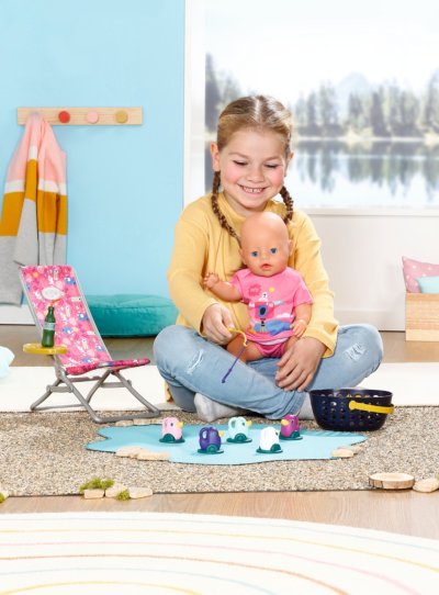 „V mori je rýb oveľa viac…“ Ale BABY born radšej chytá roztomilé káčatka. Zatiaľ čo pohodlne sedí v ružovom lehátku s farebným vzorom, snaží sa na háčik udičky chytiť jednu z piatich kačičiek. Tu a tam si usrkne limonádu, ktorú má položenú na žltom stolíku pri ležadle. Keď vylovia všetky kačičky a má ich uložené v modrom koši, vráti ich späť do rybníka a zábavná hra môže začať znova. Na túto hru na rybárčenie si BABY born obliekla ležérne dlhé ružové tričko s roztomilou potlačou.