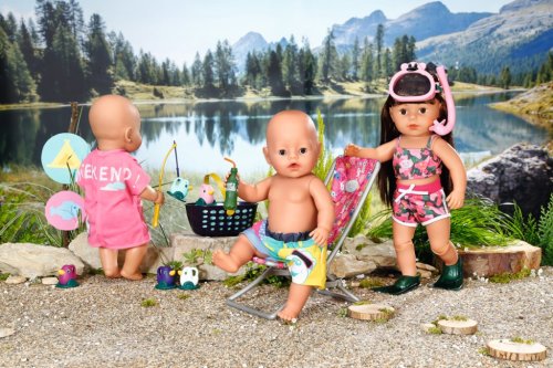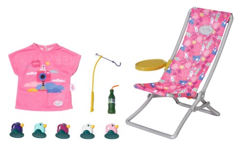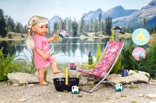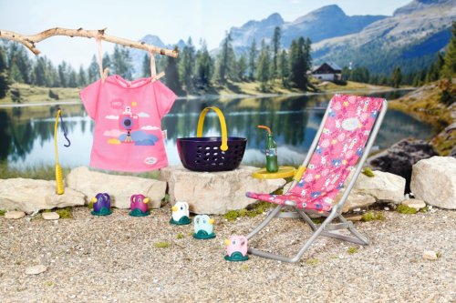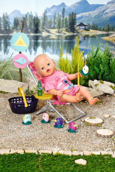 BABY born Víkendová súprava na rybárčenie obsahuje obleček, lehátko so stolíkom, fľašu s limonádou, košík, 5 kačičiek a rybársky prút.