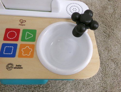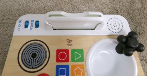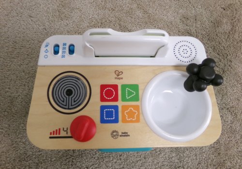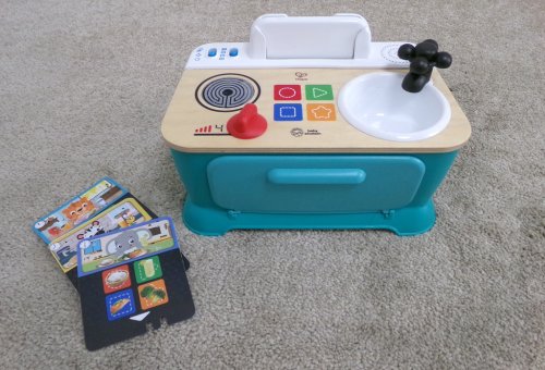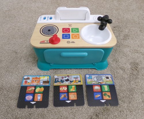 Pomôžte dieťaťu spoznať súčasti okolitého sveta, ako sú jedlá, farby a tvary, s kuchynkou Baby Einstein + Hape Magic Touch. Táto farebná kuchynka na hranie z dreva s certifikátom FSC je vybavená rúrou, drezom a varnou doskou, ktorá pomáha bábätku napodobňovať varenie! V režime Play môžu deti skúmať zvuky a melódie varenia. V režime Discovery - Objavuj sa môžu batoľatá učiť jedlá, farby a tvary v angličtine, španielčine, francúzštine a nemčine. 3 kartičky receptov pomáhajú bábätku „uvariť“ až 6 receptov na raňajky, obed alebo večeru pomocou priloženého hrnca a lyžice. Stlačte vybraný dotykový symbol na ultra citlivej varnej doske Magic Touch, aby ste uvarili každý recept za zvukov hudby a varenia. Bábätko bude zvedavé, keď bude otáčať gombíky sporáka a kohútika, čím aktivuje svetlá a zvuky. Táto malá prenosná kuchynka, ktorá je ideálna na hranie na zemi, pomáha podporovať rozvoj jemnej motoriky dieťaťa a inšpiruje k spoločnej hre s rodinou a priateľmi. Pre deti od 9 mesiacov do 4 rokov. Obsahuje 3 AA batérie.