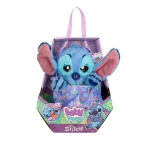 Baby Paws – plyšové šteniatko Stitch je interaktívna plyšová hračka inšpirovaná postavičkou Stitche z filmu Lilo & Stitch. Tento roztomilý kamarát je vyrobený z mäkkého a huňatého plyšu v typických modrých odtieňoch, ktoré verne zodpovedajú originálnemu vzhľadu postavičky. Stitch má veľké uši s ružovým vnútrom, ktoré sú výrazným prvkom jeho designu, a jeho oči sú navrhnuté tak, aby pôsobili prítulne a naživo. Plyšák sedí a má na krku zavesený ružový cumlík, ktorý slúži ako doplnok a pomáha mu „zaspať“.