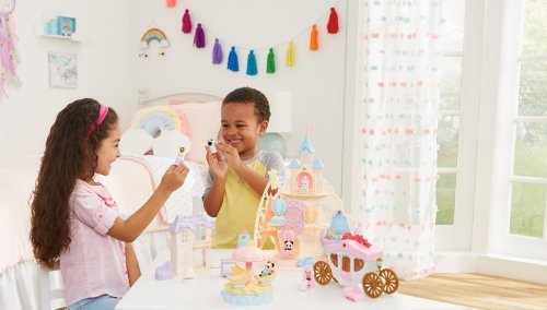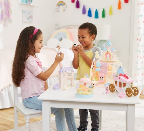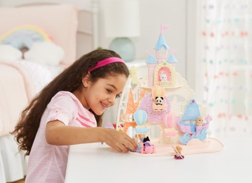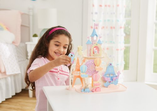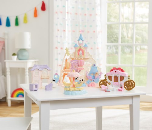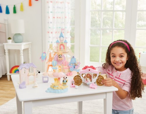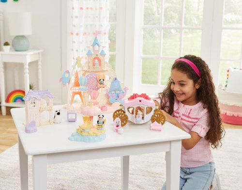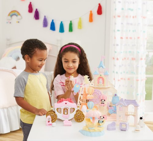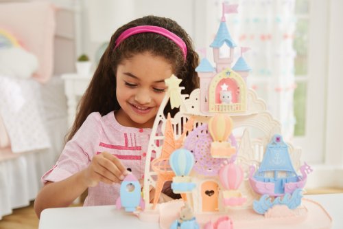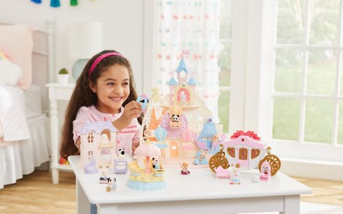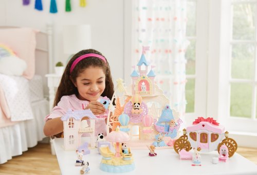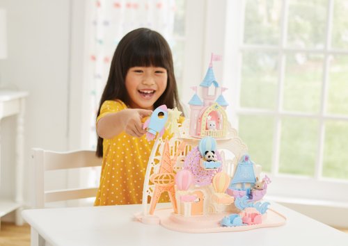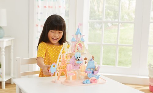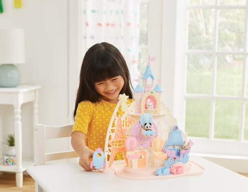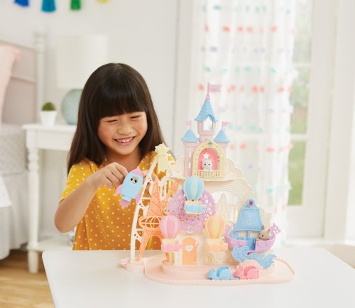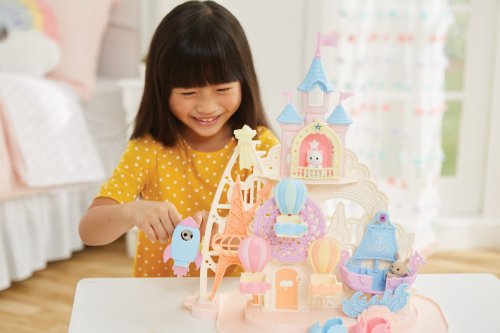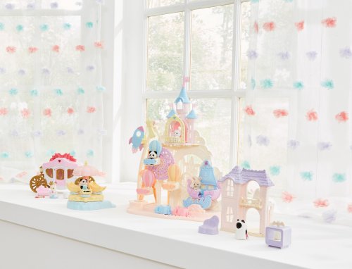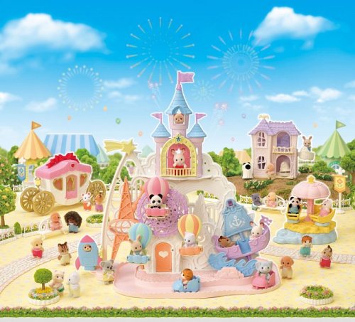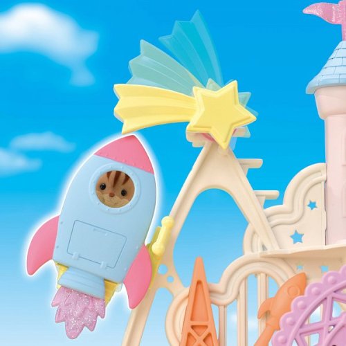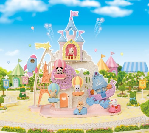 Pri veľkom lese za vstupnou bránou leží kúzelný svet av ňom sa nachádza Baby zábavný park. Kamkoľvek vaše oko dohliadne, uvidíte veselé Baby figúrky, ktoré si užívajú čas strávený v Baby zábavnom parku. Súčasťou Zábavného Baby parku v tvare hradu je ruský bicykel, vikingská loď, dráha s autíčkami a vesmírna raketa. Na točiaci sa ruský bicykel, so sedačkami v tvare teplovzdušného balóna, je možné usadiť tri baby figúrky. Dve baby figúrky sa môžu hojdať na vikingskej lodi. Na pohyblivú raketu je možné umiestniť jednu baby figúrku. Ďalšie baby figúrky si môžu pozrieť Baby zábavný park z hradného balkóna. Otvorte dvere a prejdite do zadnej časti parku, kde uvidíte druhú časť trasy pre autíčka a stôl so stoličkami, kde sa môžu baby figúrky sadnúť a rozprávať sa. V zadnej časti Baby zábavného parku je miesto až pre 30 baby figúrok. Súčasťou sady sú tri baby figúrky - Baby Pookie Panda, Baby Milk zajačik a Baby Perzská mačička. Pre ešte väčšiu zábavu môžete Baby zábavný park skombinovať so sadou Baby hviezdny kolotoč (5539, predáva sa samostatne), Strašidelným domom (5542, predáva sa samostatne) a Rodinným ružovým autom Van (5535, predáva sa samostatne). Herné sady a figúrky Sylvanian Families sú nadčasové a vysoko kvalitné hračky. Hra podnecuje predstavivosť dieťaťa. Obsahuje: 1x základňa, 1x hrad, 1x veľká vlajka, 2x malá vlajka, 3x gondola (ružová, modrá, žltá), 1x vikingská loď, 1x vlny, 1x raketa, 2x autíčko (modré a ružové), 1x kométa, 1x Baby Panda sediaca, 1x Baby Milk zajačik sediaci, 1x Baby Perzská mačička sediaca. Vek: 3+