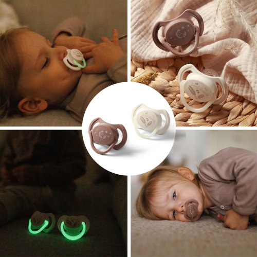 Symetrický silikónový cumlík upokojí vaše bábätko a dopraje vám chvíľku odpočinku. Sploštená špička po oboch stranách sa dokonale prispôsobí ústam dieťaťa a podporuje správny vývoj chrupu a polohu jazyka. Profilovaný štítok s otvormi umožňuje voľné dýchanie nosom a zaisťuje cirkuláciu vzduchu okolo úst. Náustok je vyrobený z hypoalergénneho, bezpečného silikónu, ktorý je odolný voči poškodeniu a neobsahuje BPA. Súprava obsahuje 2 cumlíky pre deti vo veku 18+ mesiacov – jeden na denné použitie a jeden so svietiacou rukoväťou, ideálny na nočné upokojenie.