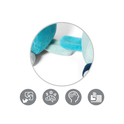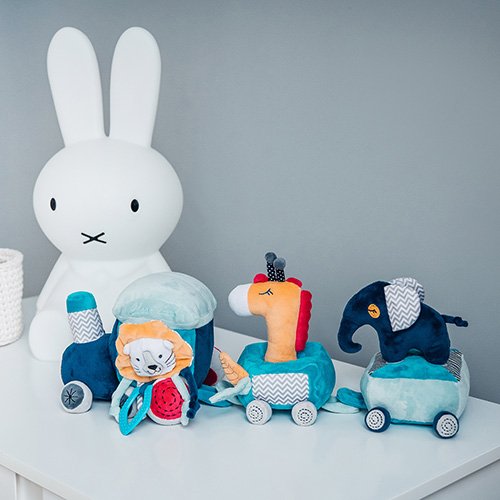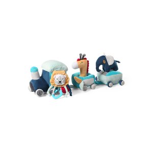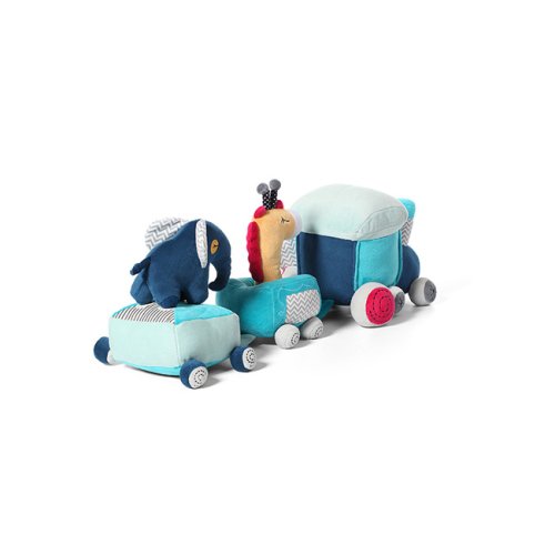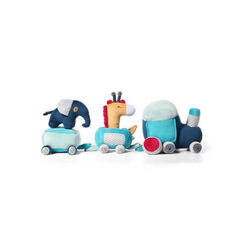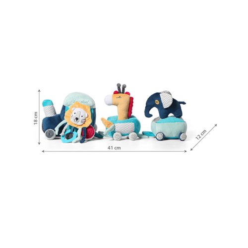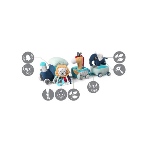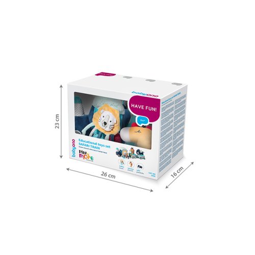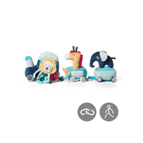 Vláčiková sada vzdelávacích hračiek Safari train sa skladá z lokomotívy s dvoma vagónmi a pripojenými plyšovými hračkami: pískajúcimi, hrkajúcimi a šuštiacimi. Hračka zoznamuje dieťa s rozmanitým svetom farieb, zvukov a tvarov. Vďaka prichyteniu na suchý zips a dômyselne navrhnutým priestorom pre hračky je možné vytvárať zaujímavé kombinácie, ktoré podnecujú kreatívne myslenie.