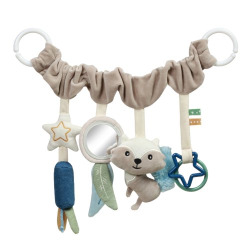 Závesná hrazdička Raccoon do kočíka a autosedačky je senzorický produkt, ktorý dokáže stimulovať hmat a zrak dieťaťa, ako aj zlepšiť jeho motorické schopnosti. Všetko, čo musíte urobiť, je pripevniť ho na kočík, kolísku alebo autosedačku, aby ste dieťa zabavili počas prechádzok a cestovania. Závesný predmet potiahnutý látkou príjemnou na dotyk je dodávaný s pôvabným medvedíkom čistotným, bezpečným zrkadlom, príjemnými zvončekmi, ako aj s prsteňom a hviezdou. Starostlivo vybrané kúsky sú atraktívne a upútajú pozornosť dieťaťa. Váš drobček sa môže hrať, objavovať svet a rozvíjať svoje oči a sluch.