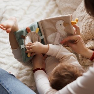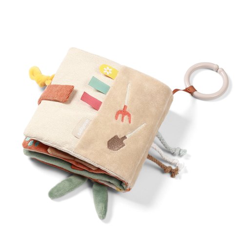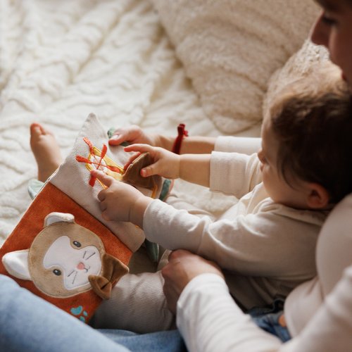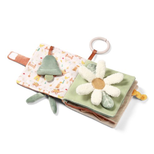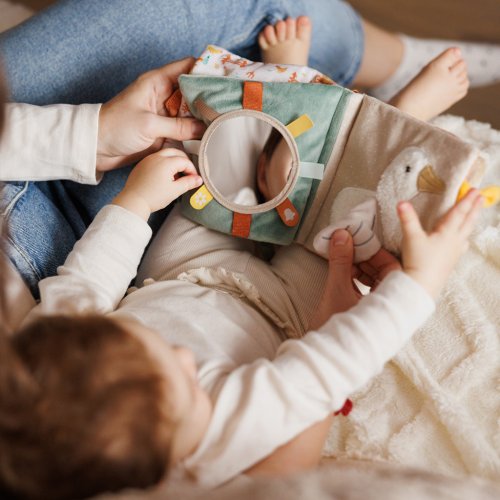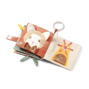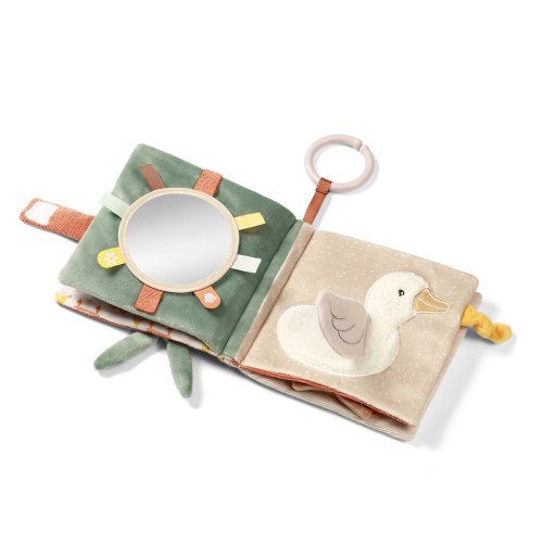Zábavné materiály a rozmanité textúry povzbudzujú k objavovaniu, zatiaľ čo zaujímavé tvary podnecujú ich fantáziu a stimulujú zrak. Stránky tejto pútavej knihy obsahujú šuštivý zvuk, ktorý pri stlačení vydáva zaujímavé zvuky, hrkálku, ktoré motivuje k zatraseniu, a zrkadlo pre objavovanie vlastného odrazu. Farebné stužky pomáhajú rozvíjať úchopové schopnosti. Túto látkovú knihu môžete zavesiť na postieľku, kočík alebo autosedačku. Je to skvelá zábava a učenie v jednom!
