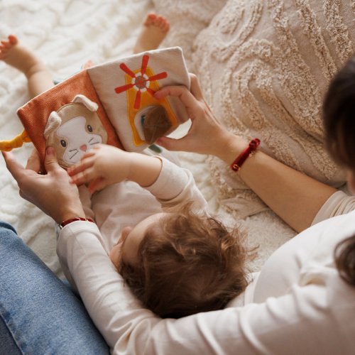- Štítky a uzly: Farebné stužky a povrázky robia z našej manipulačnej knihy skvelú voľbu pre rozvoj jemnej motoriky. Podporuje siahanie a uchopenie.
