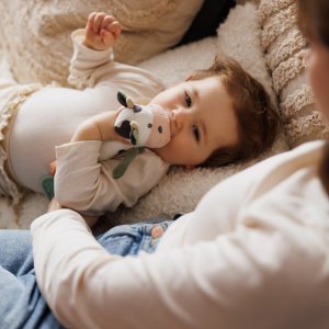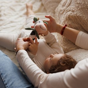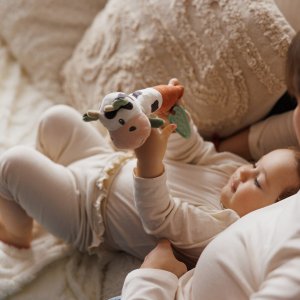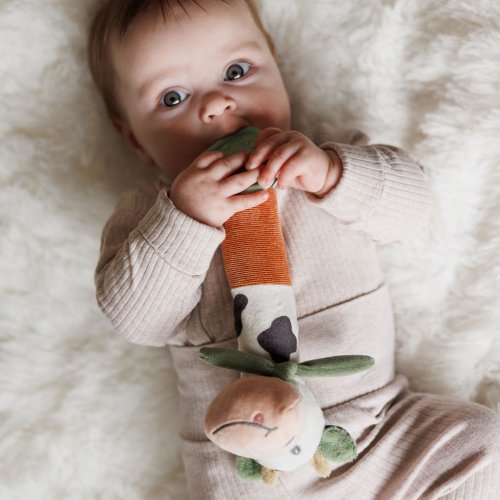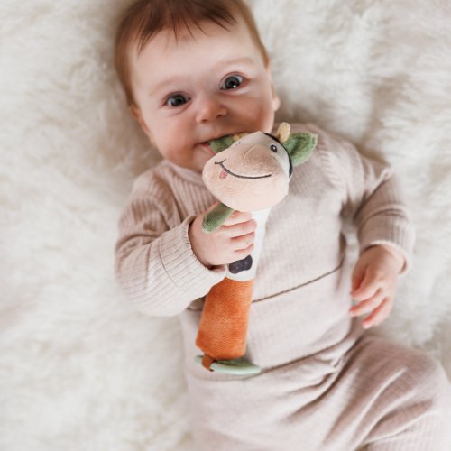 Rozkošná plyšová pískacia hračka Kravička Bingo je detská hračka, ktorá prebúdza zvedavosť a podporuje jej rozvoj. Vaše dieťa objavuje svet všetkými zmyslami – pozerá, dotýka sa, počúva a hryzie. Rôzne farby priťahujú pozornosť a mäkké ušká a uzlík povzbudzujú malé ručičky k hmataniu. Dlhé, mäkké telo uľahčuje uchopenie a vaše dieťa rozvíja jemnú motoriku a koordináciu ruka-oko. Táto interaktívna hračka stimuluje sluch – keď ju vaše dieťa stlačí, počuje zvuk. Na konci detskej pískacej hračky sme umiestnili hryzátko s výstupkami, ktoré jemne masíruje boľavé ďasná.