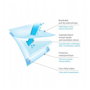 Jednorazové prebaľovacie podložky sú veľkou pomocou pri prebaľovaní dieťaťa. Môžu sa tiež použiť pre mamičky ako podložky v popôrodnom období. Mimoriadne absorpčné vlastnosti pomáhajú zaistiť komfort a hygienu. Vonkajšie plastové obloženie chráni pred znečistením, zatiaľ čo samolepiace pásky udržujú vankúšiky na svojom mieste. Superabsorpčný materiál vo vnútri podložky viaže vlhkosť rýchlo, neutralizuje akékoľvek nepríjemné pachy.