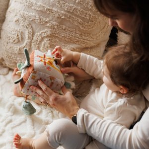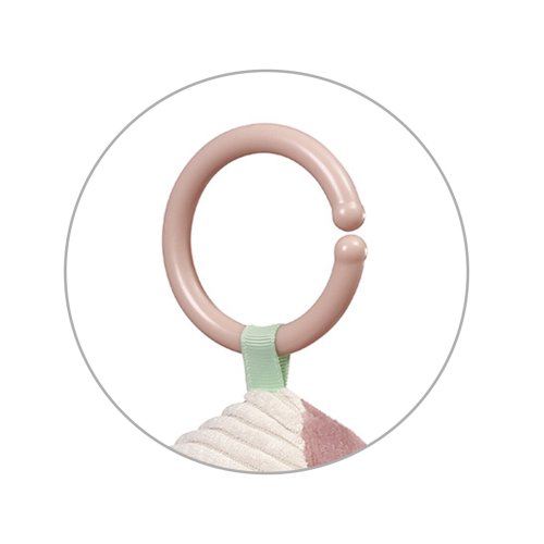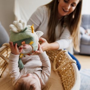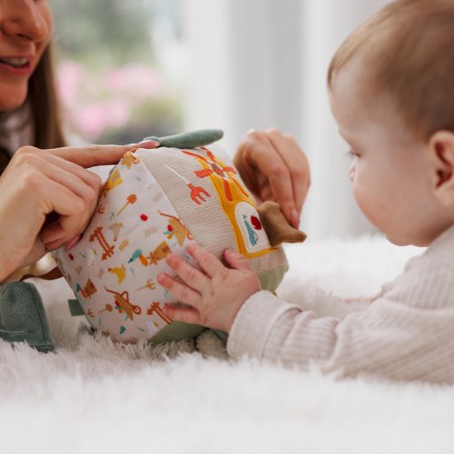 Mäkký materiál a rozmanitosť textúr stimulujú hmat, zatiaľ čo rozmanitosť farieb a tvarov púta ich zrak. Šuštiaci zvuk a jemné hrkálka rozvíjajú sluch, zrkadlo obohacuje hru a farebné stužky a uzly povzbudzujú k uchopeniu.