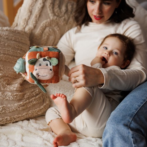 Kocka Cow Bingo plná prekvapení je senzorická hračka pre bábätká, ktorá rozvíja ich zmysly a podporuje osvojovanie nových zručností.