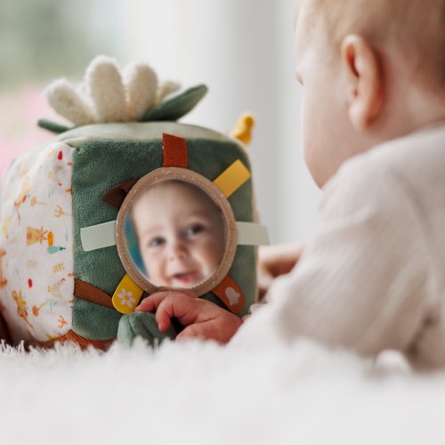 - Zrkadlo: Zrkadlo na tejto detskej hracej kocke ukazuje svet z druhej strany. Vaše dieťa bude reagovať zvedavosťou na svoj odraz a rozvíjať kognitívne zručnosti. Hra je ešte fascinujúcejšia!