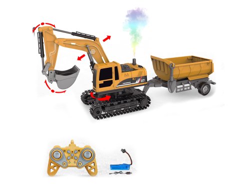 Bager 4v1 s vlečkou RC na diaľkové ovládanie. Veľkosť 45 cm, bager 24 cm. Súčasťou kovová koncovka bager, plastové koncovky; bager, nakladač drevín, búracie kladivo. Frekvencia 2.4GHz. Svetelné, zvukové a dymiace efekty. Batériový pack 3.7V 500mAh Li-ion do bagru súčasťou, 2xAA do ovládača nie sú súčasťou. USB kábel súčasťou. Nádobka na vodu súčasťou. Nádržka na vodu v zadnej časti bagru. Prepínač ON/OFF zo spodnej strane otočnej veže. Ovládač - ľavá páčka - pohyb vpred a vzad, pravá páčka - otáčanie vľavo a vpravo, tlačidlo demo, tlačidlo aktivácie zvukových efektov, tlačidlo dymiace efekty, tlačidlo otáčania veže vľavo, tlačidlo otáčania veže vpravo, tlačidlo kladenia ramena, tlačidlo zdvíhania ramena.